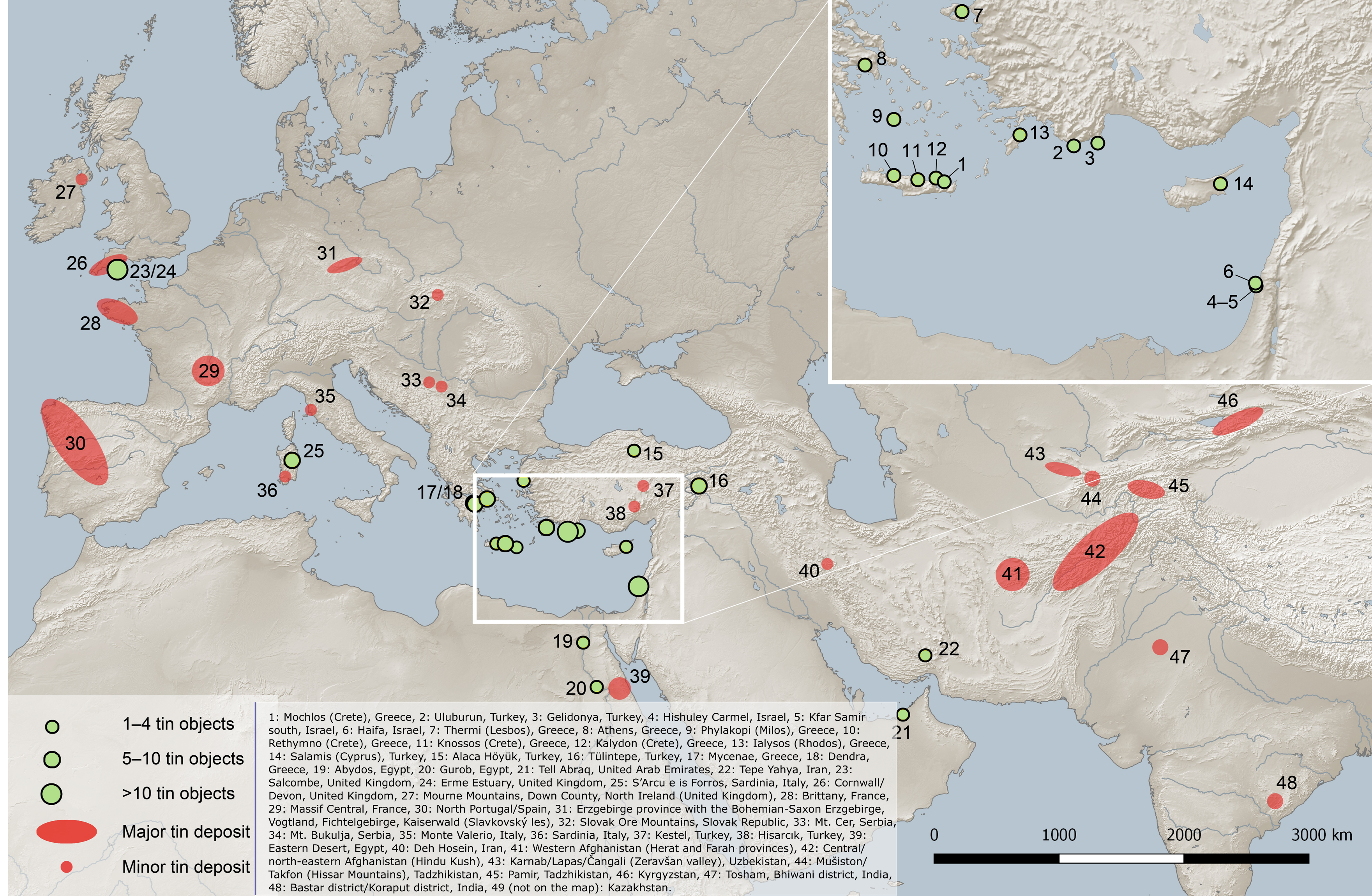 Tin resources were more abundant in China than in the West, yet the West adopted bronze at scale nearly a millennium earlier. On the map above, you can see that there are no significant sources of copper in the Eastern Mediterranean or Near East. The main trade routes ran 2500 km to Badakhshan in modern day Afghanistan, Cornwall in modern England, or Northwest Iberia in modern Spain, to find significant amounts of tin.